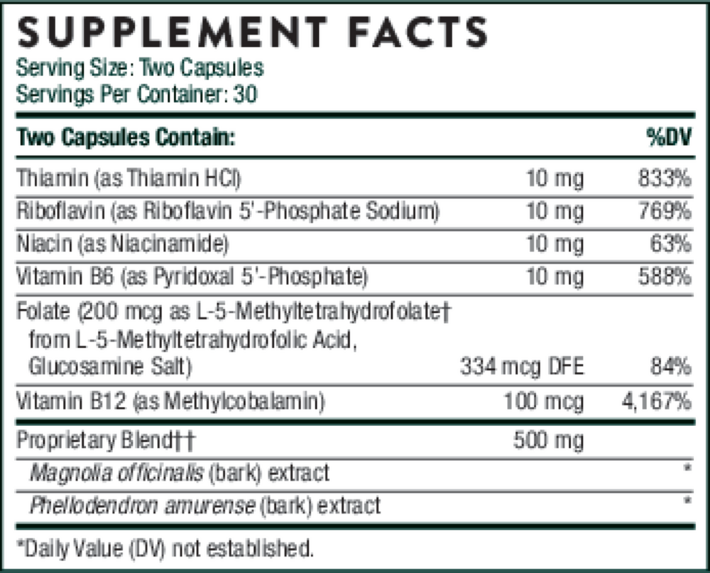 This formula is especially beneficial for individuals who experience occasional anxiety, stress-related eating, or difficulty maintaining a healthy weight during stressful periods.* Six B vitamins—including the active forms of vitamins B2, B6, B12, and folate—are included to support healthy mood, nervous system function, and energy metabolism while helping mitigate the effects of stress.*